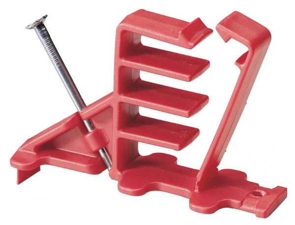 Fork Cable Spacer, Side Entry, Slot Width 6 in, Slot Height 2.8 in, Mounting Method Integrated Nail, Material Polypropylene, Color Red, Length 2.25 in, Width 3 in, Height 2.25 in, Temp. Range Not Rated, Standards RoHS Compliant, Flame Retardant No, Metal Detectable No, Outdoor Use No, Package Quantity 20