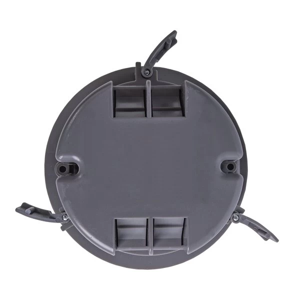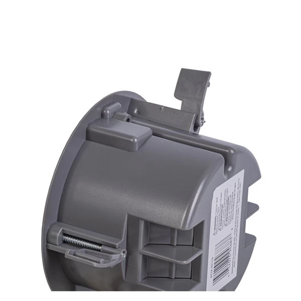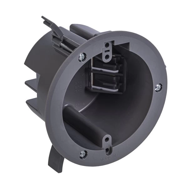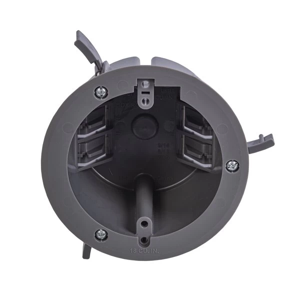 GB Electrical Box, Cable Entry Hinge, Number of Gangs 1, Cubic Capacity 18 cuin, Round, Polycarbonate, Gray, 44 in W, 44 in D, 27 in H, Clamp, InCeiling Mounting, Suitable for NonMetallic Sheathed Cable and Up to 6 lb Light Fixture Installation, Includes 2 Swing Clamps and Mounting Ears