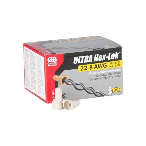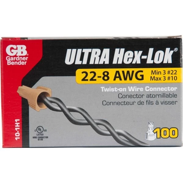 These multirange hex head connectors cover 95 of everyday applications making them the simple choice for all of your wire connection needs Don’t worry about using a hex tool to install you can’t over torque this connector because it’s patented hex head design strips out at UL torque saving the wires and your fingers Inside the connector a zincplated square wire spring ensures a secure connection that resists corrosion The thermoplastic shell is designed for longlasting strength and resists chemicals while the deep skirt supports smooth wire entry and coverage of stripped wires