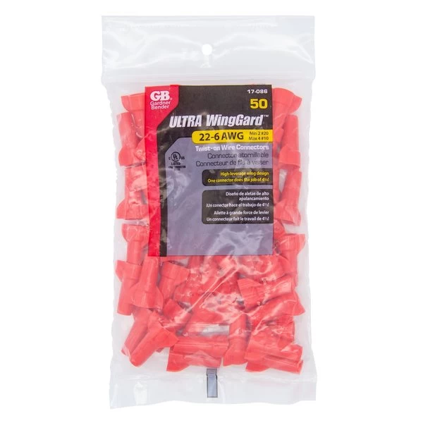 GB’s WingGard twiston wire connectors offer unsurpassed quality and durability in a highleverage, easyon, wingtype design These hardworking connectors offer a wide range of connection options essentially ensuring that one size can do the job of multiple standard connectors The swept wings provide added turning torque and reduce the strain of multiple applications The thermoplastic shell provides strength and resistance to chemicals while a long skirt prevents exposure of bare wire The zincplated square wirespring inside instantly adjusts to the shape and size of the splice upon insertion ensuring a longlasting connection that resists corrosion and exceeds UL standards for dielectric strength and wire pullout force